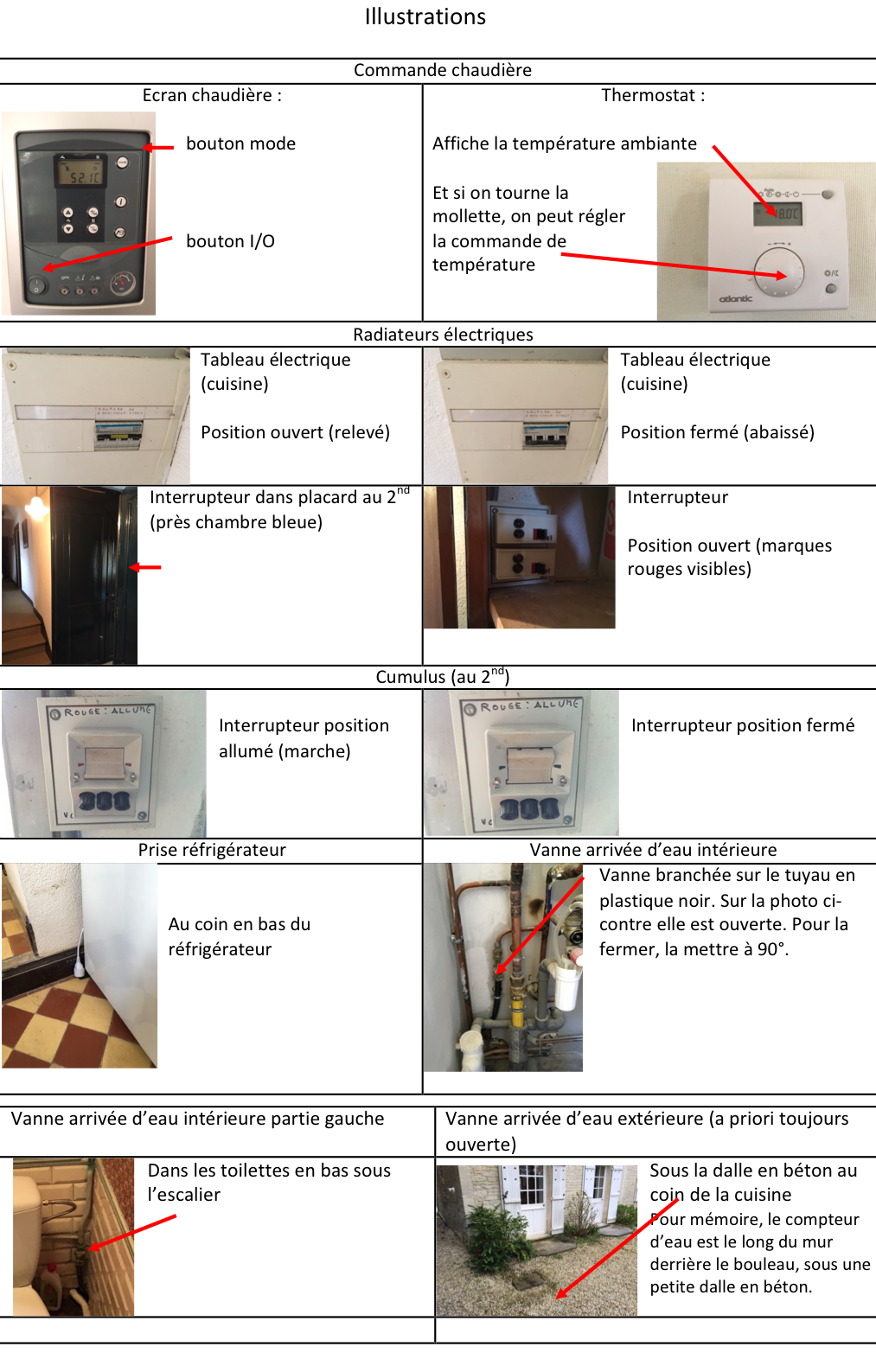 - Les interrupteurs de chauffage électrique (sur le tableau électrique dans la cuisine et dans le placard à côté de la chambre bleue au 2ème étage) et du cumulus (2ème étage au fond à droite en sortant de l’escalier) sont fermés